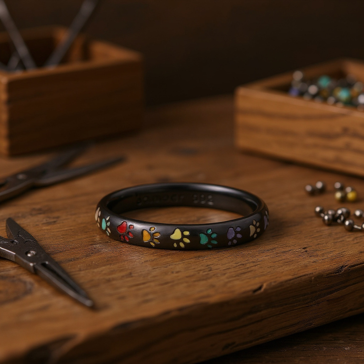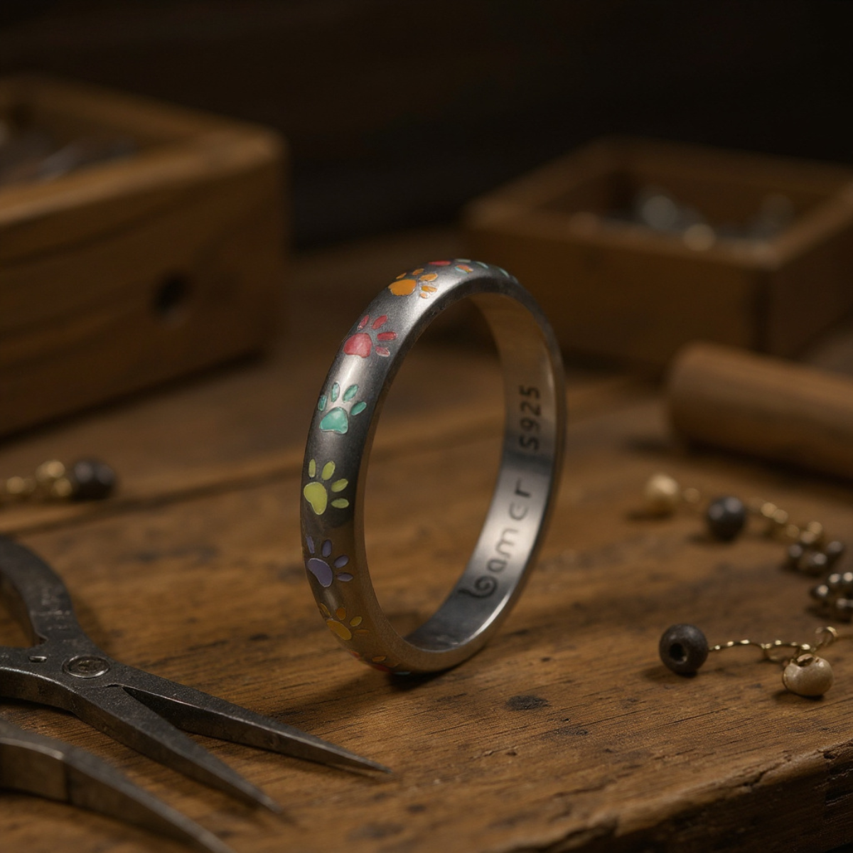 🐾 Heartfelt Design – A colorful enamel paw print set against an oxidized silver band – a tender reminder of unconditional love and companionship.